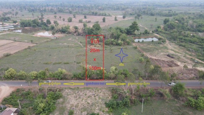 ដីសម្រាប់លក់(ផ្លូវជាតិ ចម្ងាយ៤គម ពីទីរួមខេត្ត) តម្លៃ៖ 1,300$/m ទំហំ៖ 20m x 150m ទីតាំង៖ ភូមិពោធិ៍ខឿន ឃុំពោធិ៍ ស្រុកត្បែងមានជ័យ ខេត្តព្រះវិហារ។