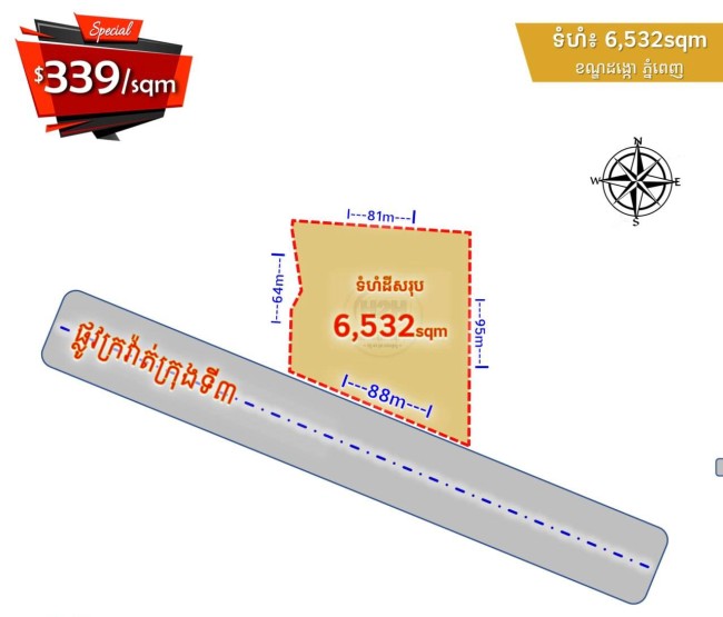 👉 តម្លៃលក់ | Sale price: $339/sqm (ក្បាលដីជាប់ផ្លូវ 88m)