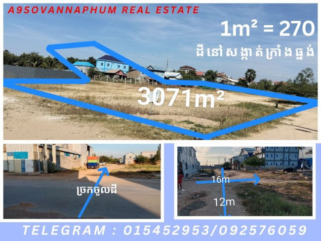 👉 ទីតាំងដី : នៅភូមិ:សំរោងទាវ,សង្កាត់:ក្រាំងធ្នង់,ខណ្ឌ:ដង្កោ ,រាជធានី:ភ្នំពេញ