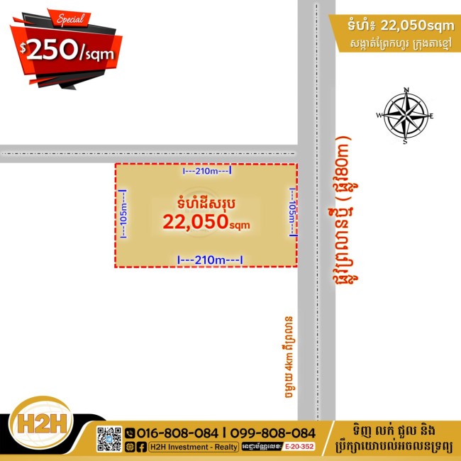 👉 ទំហំដី | Land size: 22,050m2 (ជាប់ផ្លូវ 105m)