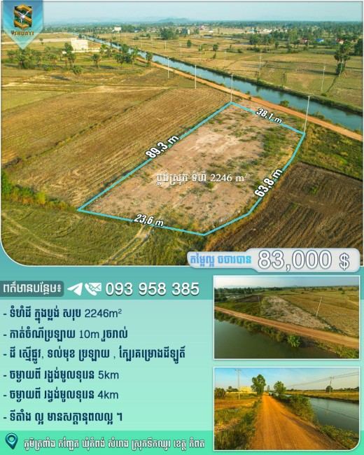 ដីលក់ រកមិនបានទេ តំលៃក៍ល្អ ទីតាំងក៍សម ត្រឹម 83,000$ នៅចរចារបាន ទំហំ 2246 ម2 ទល់មុខមាត់ទឹក 38ម 4kmពីក្រុងកំពត សាកសមប្លង់លំហែរ ទាក់ទងមើលតាម: 093958385, 077223711