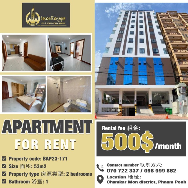 ផ្ទះល្វែងសម្រាប់ជួល លេខកូដអចលនទ្រព្យ: BAP23-171 តម្លៃជួល៖ 500$/ខែ ទំហំដី៖ 53m2 ប្រភេទអចលនទ្រព្យ 房源类型 : បន្ទប់គេង 2 បន្ទប់ទឹក 浴室: 1 ទីតាំងៈ ខណ្ឌចំការមន រាជធានីភ្នំពេញ លេខទំនាក់ទំនង 联系方式: 070 722 337 / 098 999 862