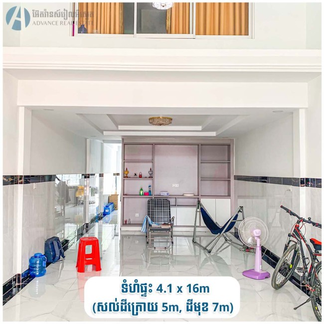 ✨ ទំហំផ្ទះ៖ 4,1 x 16ម៉ែត្រ (នៅសល់ដីក្រោយ 5ម៉ែត្រ និងសល់ដីមុខ 7ម៉ែត្រ)