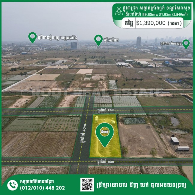 👉 ផ្លូវមុខខាងជើង40m កែងខាងលិច16m និងកែងខាងកើត12m សង្កាត់ក្រាំងធ្នង់ ខណ្ឌសែនសុខ រាជធានីភ្នំពេញ