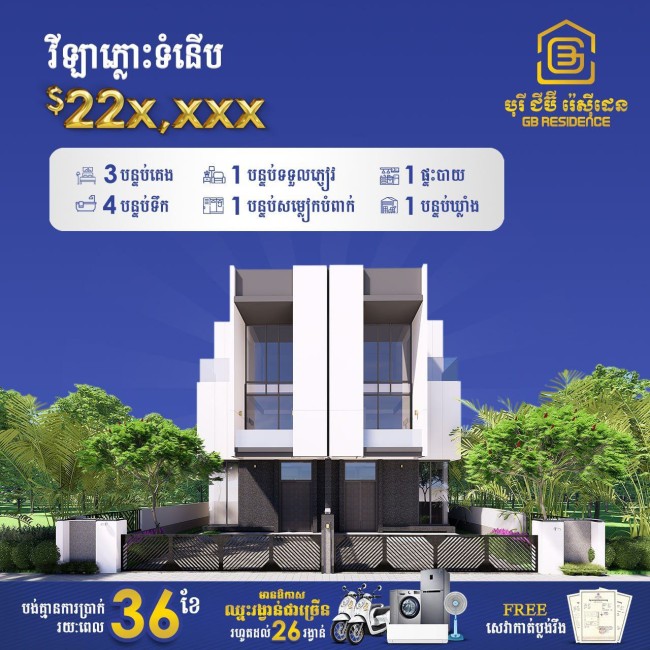 លែងបារម្ភទៀតហើយ ជាមួយគម្រោងបុរី ជីប៊ី រ៉េស៊ីដេន មានផ្ទះច្រើនជម្រើស សម្រាប់លោកអ្នកស្នាក់នៅបែប ឯកជនភាព ឬរស់នៅបែបស្ងប់ស្ងាត់ មានសុវត្ថិភាព មាននៅផ្ទះវីឡាភ្លោះប្រណិត